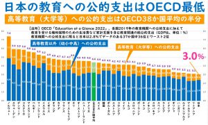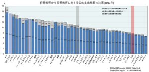 教育振興基本計画54 2025/04/14 Ⅲ.今後の教育政策の遂行に当たっての評価・投資等の在り方 (2)教育投資の在り方 (第3期計画までの教育投資の状況) ○第3期計画期間においては、「新しい経済政策パッケージ」等に基づき、幼児教育・保育の無償化や高等学校等就学支援金による授業料支援、高等教育の修学支援新制度の創設等により、教育費負担の大幅な軽減が図られた。また、GIGAスクール構想による1人1台端末と高速通信ネットワーク等のICT環境の整備、小学校における35人学級の計画的整備や高学年教科担任制の推進等の教職員定数の改善と支援スタッフの充実、博士後期課程学生に対する経済支援の拡充、学校施設の耐震化の推進など、年々財政状況が厳しくなる中にあっても必要な財源を確保し取組を進めてきた。こうした教育投資の成果として前述の第3期計画期間中の成果と課題に示した国際学力調査における高い学力水準の維持や進学率の向上、教育環境の整備が図られてきている。 ○教育投資に関する国際的な状況について見ると、公財政教育支出総額については、例えば、GDP(国内総生産)比で見た場合、初等教育段階から高等教育段階までについて、OECD諸国の平均が4.4%であるのに対して我が国は3.0%(いずれも令和元(2019)年度)となっている。また、在学者一人当たりの公財政教育支出額で見ると、初等教育段階から高等教育段階までについて、OECD諸国の平均10,161ドルであるのに対して我が国は8,944ドル(いずれも令和元(2019)年度)となっている。また、租税負担率(対NI(国民所得)比)は、OECD諸国の平均35.4%であるのに対して、我が国は25.8%である。こうしたデータは、全人口に占める在学者数の割合、一般政府総支出の国力に対する規模やGDPの規模など様々な要素を勘案する必要があり、単純に判断することはできないが、政府においては、現下の様々な教育課題に対応し、所要の施策を講じるために引き続き必要な教育投資を確保する必要がある。