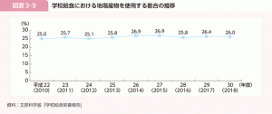 食育推進施策の基本的枠組み 202 2025/08/25 <7>学校給食における地場産物を使用する割合 学校給食における地場産物を使用する割合(食材数ベース)は26.0%であり、前回の調査結果(26.4%:平成29(2017)年度)と比べて、0.4ポイント減少しています。 第3次基本計画作成時の調査結果(26.9%:平成26(2014)年度)と比べると、0.9ポイント減少しています(図表3-9)。