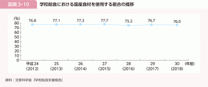 食育推進施策の基本的枠組み 203 2025/08/26 <8>学校給食における国産食材を使用する割合 学校給食における国産食材を使用する割合(食材数ベース)は76.0%であり、前回の調査結果(76.7%:平成29(2017)年度)と比べて、0.7ポイント減少しています。 第3次基本計画作成時の調査結果(77.3%:平成26(2014)年度)と比べると、1.3ポイント減少しています(図表3-10)。