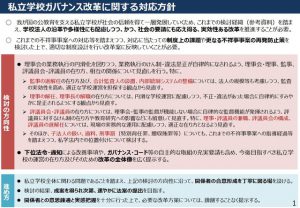 教育振興基本計画140 2025/08/19 Ⅳ.今後5年間の教育政策の目標と基本施策 (目標、基本施策及び指標) 目標15 安全・安心で質の高い教育研究環境の整備、児童生徒等の安全確保 ○私立学校の教育研究基盤の整備 ・私立学校の果たしている役割に鑑み、教育研究基盤整備に係る施策を引き続き推進し、私立学校の教育条件の維持向上及び学生等の経済的負担の軽減を図るとともに、経営の健全性を高める。 ・各学校法人の確固とした財政基盤の確立のため、各学校法人が寄附金収入等の多元的な資金を調達するための環境をより一層整備するとともに、私立学校への寄附の促進が図られるよう、寄附税制の普及啓発や、先進事例の紹介等を実施する。 ・各学校法人が、建学の精神を踏まえつつ、自律的なガバナンスの強化に取り組むとともに、自らの経営状況を分析し、学生・地域・社会のニーズを十分に把握した上で、自己の強みとなる部門の強化や不採算部門の見直し等を検討するなど、学校法人が自ら的確な経営判断を行うことができるよう、必要な情報提供・経営相談・経営指導を強化する。また、経営上の課題を抱える学校法人については、経営改善のための指導を行うとともに、経営改善が見込まれず、学生保護の観点から必要な場合には、他法人との合併や撤退等を含む早期の適切な経営判断が行われるよう指導を徹底する。あわせて、学校法人の財務情報等の積極的な公開を更に促す。