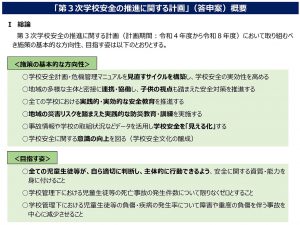 教育振興基本計画141 2025/08/20 Ⅳ.今後5年間の教育政策の目標と基本施策 (目標、基本施策及び指標) 目標15 安全・安心で質の高い教育研究環境の整備、児童生徒等の安全確保 ○文教施設の官民連携 ・学校施設の地域の中核拠点化に向けて、複合施設化や未利用時間の利活用等、学校施設における官民連携の活用について、課題や可能性を検証するなど、情報の収集や提供を行う。 ○学校安全の推進 ・児童生徒等が生き生きと活動し、安心して学べるようにするためには、その安全の確保が保障されることが不可欠の前提であるため、「第3次学校安全の推進に関する計画」を踏まえた、学校安全に関する組織的取組の推進、家庭、地域、関係機関等との連携・協働による学校安全の推進、学校における安全教育、学校における安全管理の取組を進める。 ・災害が生じた際の学校安全の確保、学校施設の防災機能強化などの、教育環境の確保に取り組む。あわせて、防災教育の充実を図る。