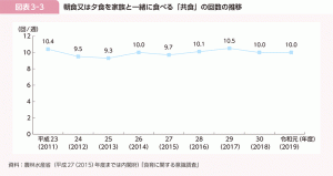 食育推進施策の基本的枠組み 197 2025/08/18 <2>朝食又は夕食を家族と一緒に食べる「共食」の回数 朝食又は夕食を家族と一緒に食べる「共食」の回数(*1)は、一週間当たり10.0回(朝食4.5回、夕食5.5回の合計)であり、前回の調査結果(週10.0回(朝食4.5回、夕食5.5回の合計):平成30(2018)年度)と同値です。 また、第3次基本計画作成時の一週間当たり9.7回(朝食4.4回、夕食5.3回の合計:平成27(2015)年度)と比べて0.3回増加しています(図表3-3)。 朝食、夕食を家族と一緒に「ほとんど毎日食べる」人の割合は朝食56.6%、夕食67.6%であり、前回の調査結果(朝食57.3%、夕食67.2%:平成30(2018)年度)と比べて、それぞれ0.7ポイント減少、0.4ポイント増加しています。 第3次基本計画作成時の調査結果(朝食54.5%、夕食64.0%:平成27(2015)年度)と比べると、それぞれ2.1ポイント、3.6ポイント増加しています(図表3-4)。 *1 共食の回数は、「ほとんど毎日食べる」を週7回、「週に4~5日食べる」を4.5回、「週に2~3日食べる」を2.5回、「週に1日程度食べる」を1回とし、それぞれ朝食・夕食ごとに、該当人数を掛け、合計したものを全体数で割り、朝食と夕食の回数を足して週当たりの回数を出している。