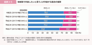 食育推進施策の基本的枠組み 198 2025/08/19 <3>地域等で共食したいと思う人が共食する割合 地域や所属コミュニティー(職場等を含む。)での食事会等の機会があれば「参加したいと思う」(「とてもそう思う」及び「そう思う」)と回答した43.3%の人のうち、過去1年間に地域等での共食の場へ「参加した」と回答した人の割合は73.4%であり、前回の調査結果(77.6%:平成30(2018)年度)と比べて、4.2ポイント減少しています。 第3次基本計画作成時の調査結果(64.6%:平成27(2015)年度)と比べると、8.8ポイント増加しています(図表3-5)。