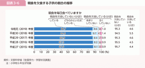 食育推進施策の基本的枠組み 199 2025/08/20 <4>朝食を欠食する子供の割合 朝食を欠食する子供(朝食を毎日食べることを「全くしていない」及び「あまりしていない」と回答した小学校6年生)の割合は4.6%であり、前回の調査結果(5.5%:平成30(2018)年度)と比べて、0.9ポイント減少しています。 第3次基本計画作成時の調査結果(4.4%:平成27(2015)年度)と比べると、0.2ポイント増加しています(図表3-6)。
