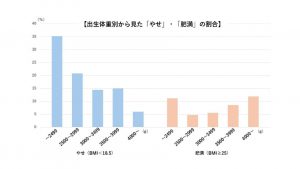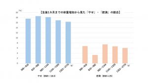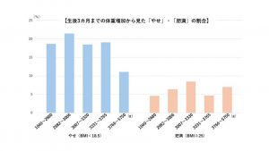 子どもの成長24 2026/04/10 「授乳や栄養摂取の制限は慎重にすべき」乳児期の体重増加は将来の肥満リスクと関連しない可能性 国立成育医療研究センター 生後6カ月までに体重が多く増加していても、将来において肥満(BMI25以上)になる割合は増加しないことを示すデータが報告された。国立成育医療研究センターの研究グループの成果であり、「Journal of Developmental Origins of Health and Disease」に論文が掲載されるとともに、プレスリリースが発行された。 研究の概要:生後6カ月の体重増加は成人後の肥満と関連がない 国立成育医療研究センターの研究グループは、母子健康手帳の情報を用いたコホート研究により、「乳児期の体重増加」が「成人期の肥満」の割合にどのような影響を与えるのかについて検討した。その結果、生後6カ月までに体重が多く増加していても、将来において肥満(BMI≧25)になる割合が増加しないことを明らかにした。一方で、成人期における‘やせ’(BMI<18.5)の割合は低下していた(図1〜図4)。 母子健康手帳に掲載されている成長曲線よりも多く体重が増えていると、将来肥満になるかもしれないと不安に思う保護者は多いかもしれないが、体重増加だけを理由に授乳量を制限しなくてもよい可能性が示唆された。 本研究は、同センターを受診した1,441人の妊婦を対象としている。その妊婦が赤ちゃんだった頃(過去)の体重増加を当時の母子健康手帳に記録されたデータから調べ、出生から生後6カ月までの体重増加と、妊娠前(現在)のBMIを比較し、分析した。 明らかになった主なポイントは以下のとおり。